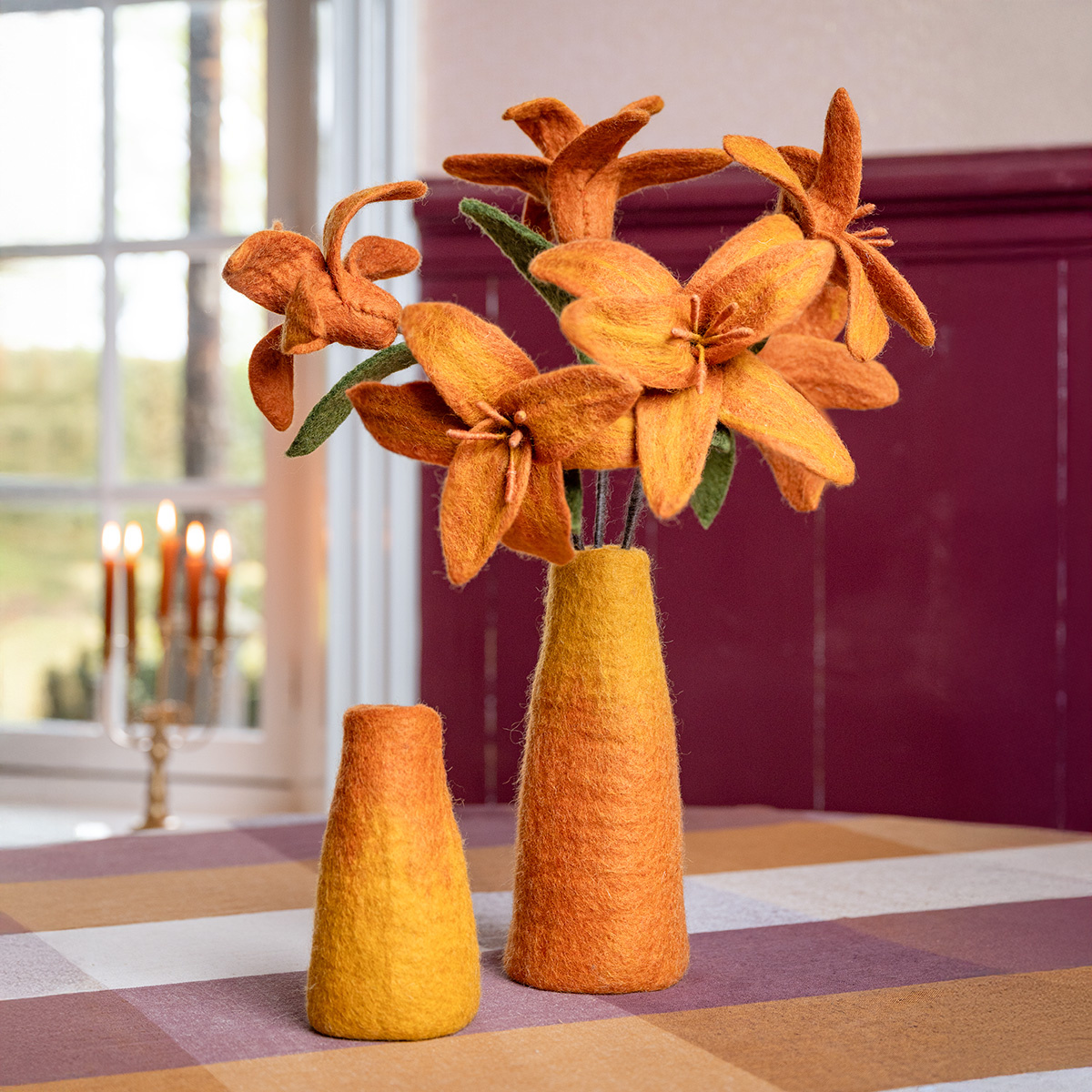 Wunderschöne Filzblume, handgefertigt von Frauen in Nepal. In den Stiel ist ein Metalldraht eingearbeitet, so dass die Blume bei Bedarf in Form gebogen werden kann.