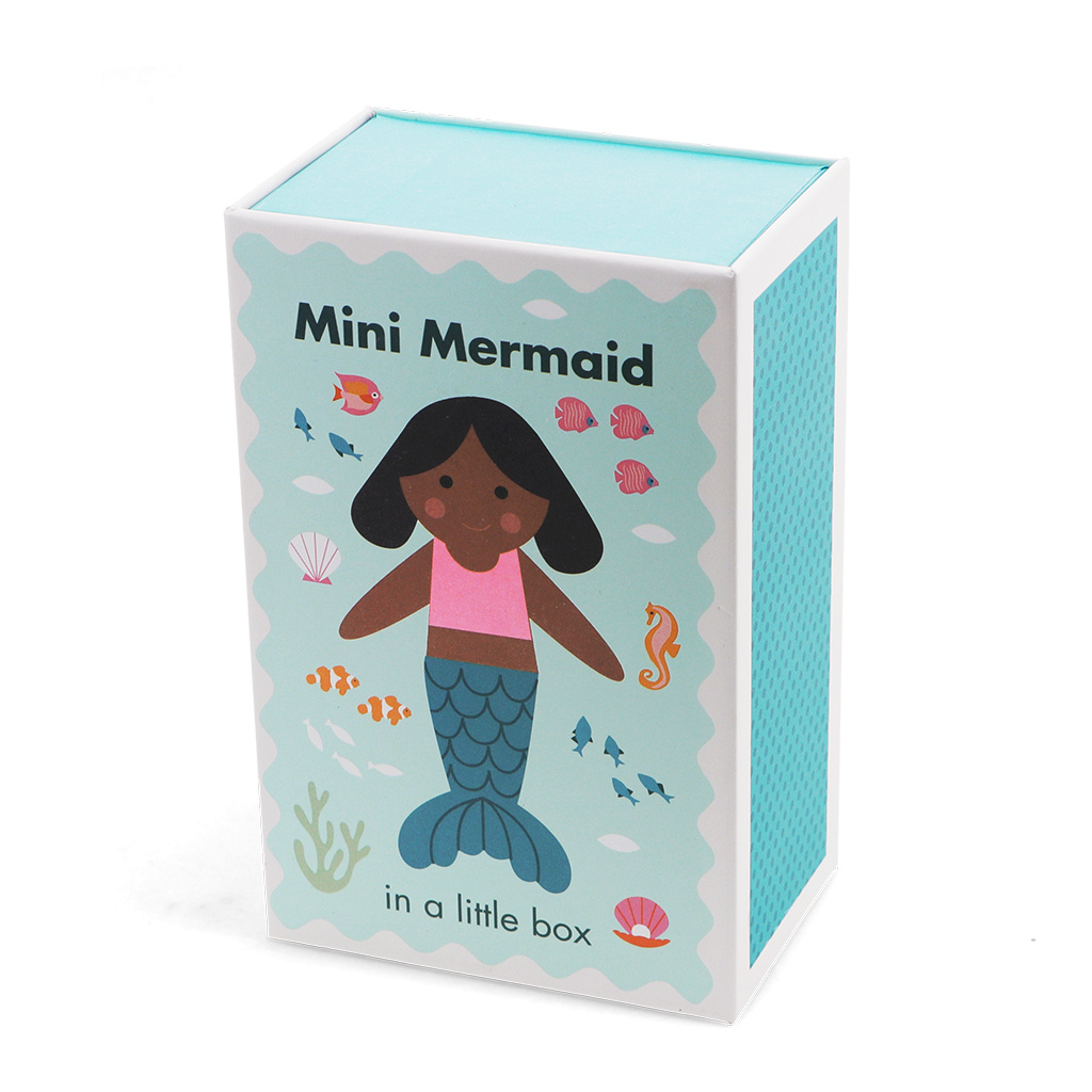 Eine bezaubernde Miniatur-Meerjungfrau als Kuscheltier mit einer wunderschönen blauen Schwanzflosse und passendem rosa Oberteil. Verpackt in einer hübschen, illustrierten Geschenkbox im Streichholzschachtel-Stil.