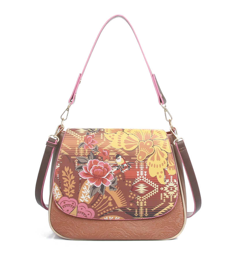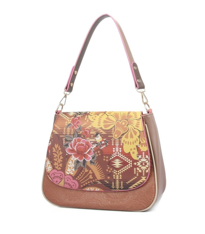 Im Hauptfach der Tasche befinden sich zwei offene Innenfächer und eines mit Reißverschluss. An der Außenseite ist ein weiteres kleines Fach, ebenfalls mit Reißverschluss. Ein kurzer und ein längerer Schulterriemen runden die Tasche ab.