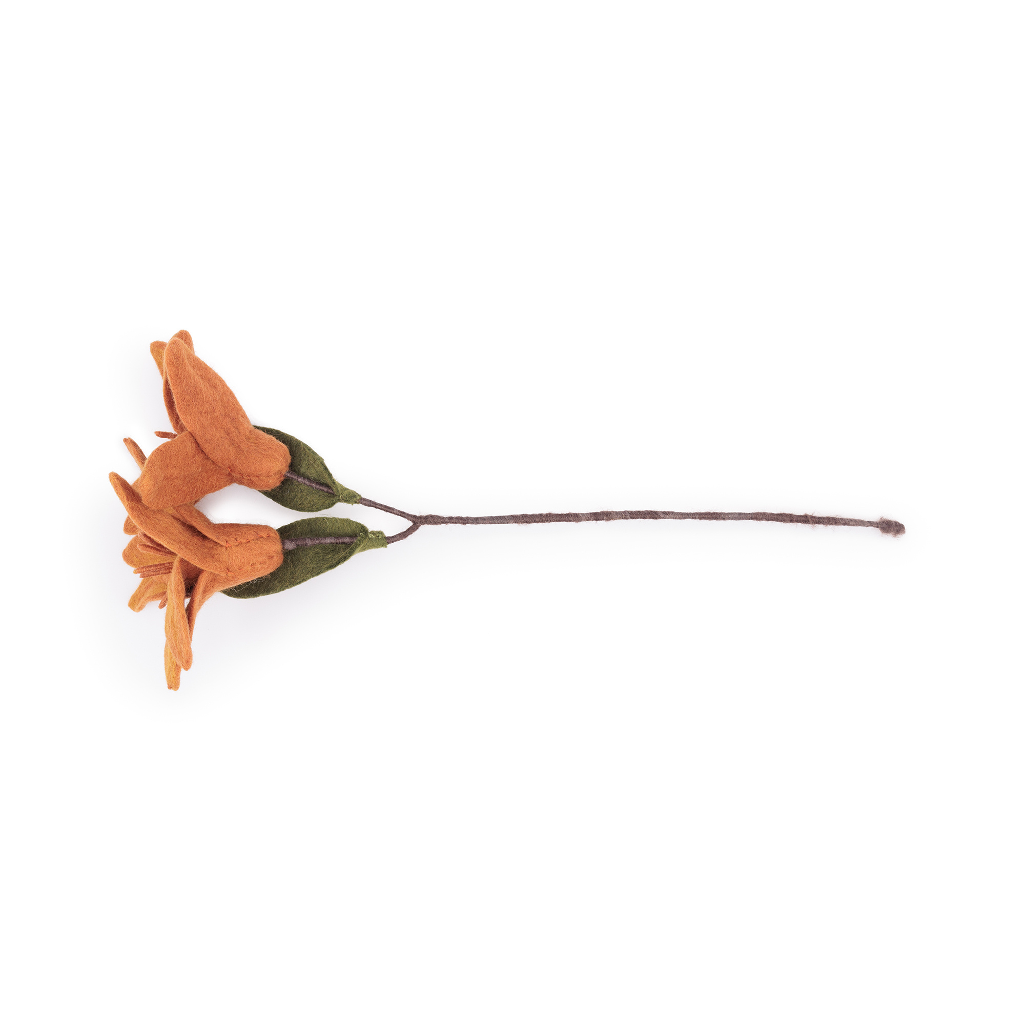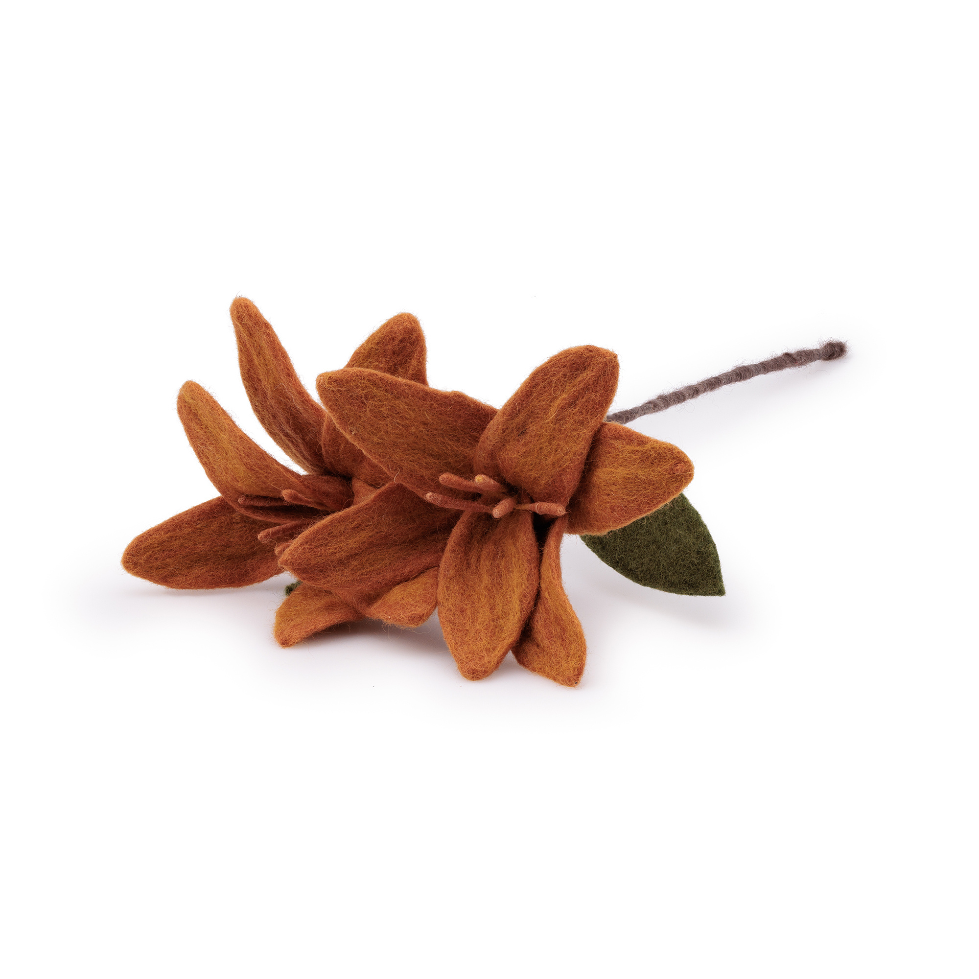 Beautiful felt flower handmade by women in Nepal. A metal wire is incorporated into the stem so that the flower can be bent into shape if necessary.