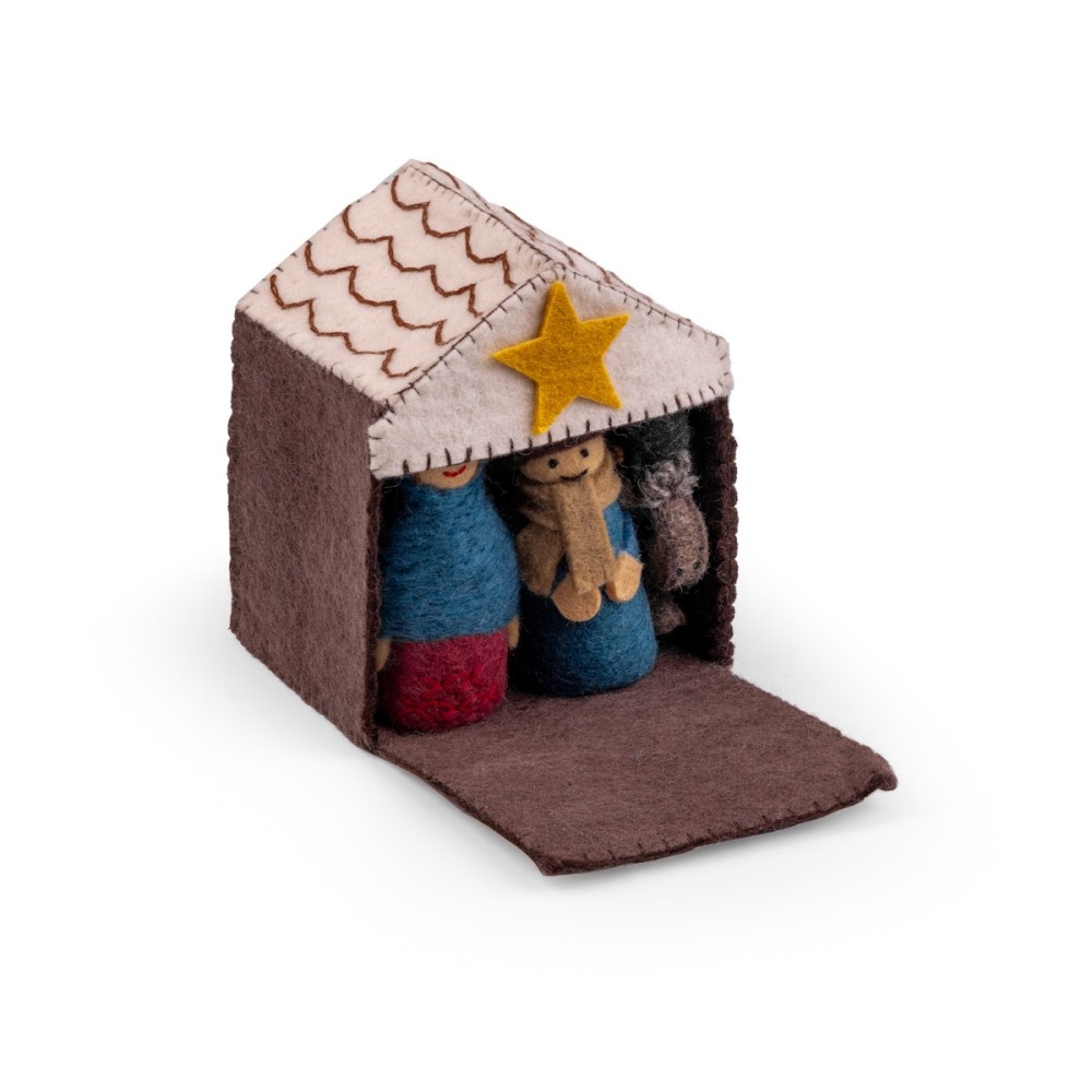 Felt nativity scene. The Christmas figures all fit in the felt stable, making it very compact to store! The package contains the following Christmas figures: Jesus, Mary, Joseph, the Three Kings, an angel, the shepherd, an ox, a donkey and a sheep.