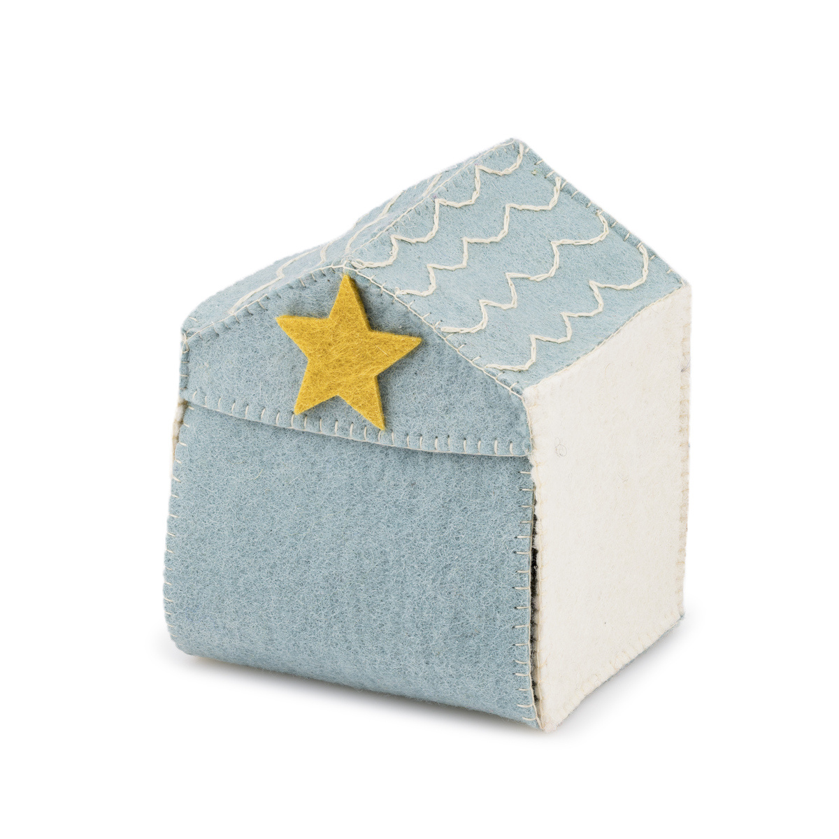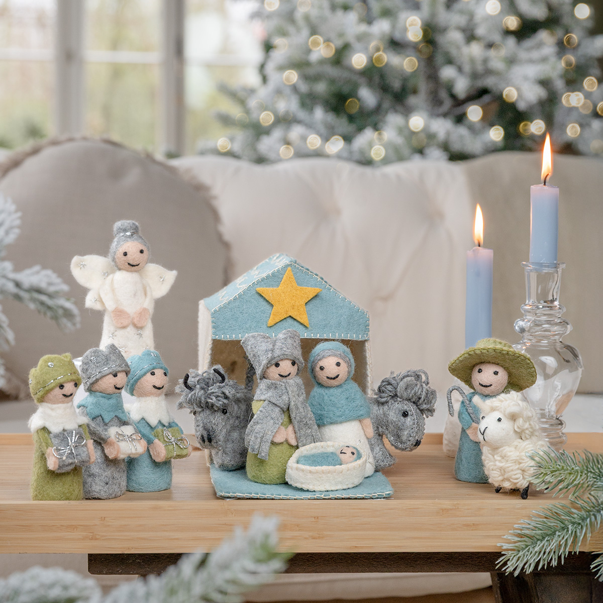 Felt nativity scene. The Christmas figures all fit in the felt stable, making it very compact to store! The package contains the following Christmas figures: Jesus, Mary, Joseph, the Three Kings, an angel, the shepherd, an ox, a donkey and a sheep.