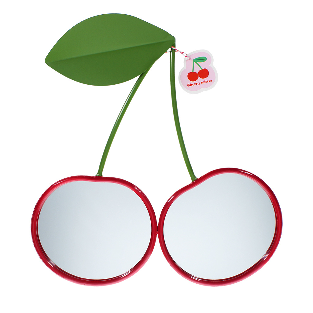 Decorative cherry-shaped wall mirror. Comprising two round mirrors, connected by green stems and a large leaf, this fun retro-style design adds character and a pop of colour to any interior wall. Ideal for bedrooms, living rooms or hallways.